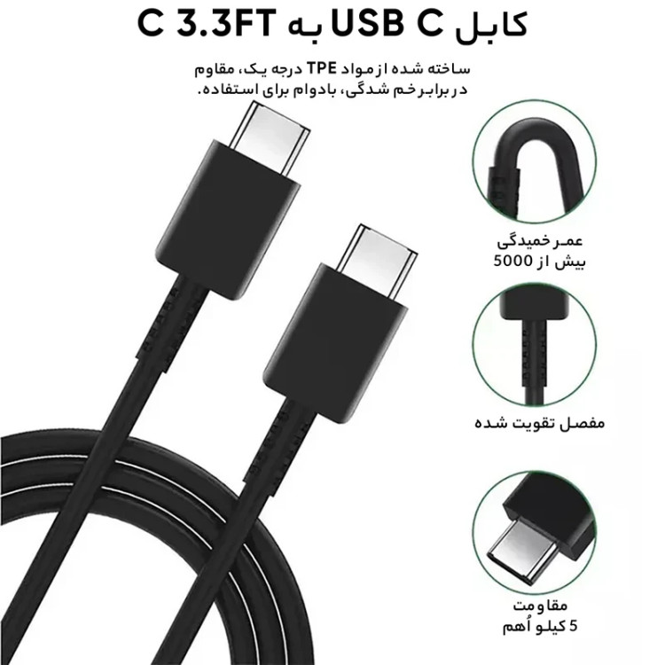 این مدل نیز مانند مدل سه پین دارای درگاه USB-C است که از طریق آن به دستگاه متصل میشود. به دلیل اینکه استاندارد USB-C تقریباً در همه دستگاههای جدید سامسونگ و بسیاری از برندهای دیگر استفاده میشود، این شارژر بهطور گستردهای قابل استفاده است.